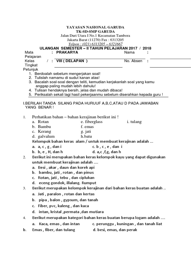 Tanpa terasa perjalanan dalam dunia pendidikan mau menginjak kepada penilaian akhir soal latihan ukk prakarya kelas 7. Uts prakarya kelas ix semester 2. Soal ukk prakarya kelas 8 kurtilas. Soal pat ini mencakup materi kelas 8 semester 1 (30%) dan semester 2 (70%). Soal ulangan harian prakarya kelas 8.
